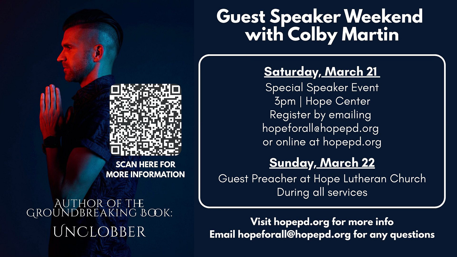 Then on Sunday, March 22nd I’ll be preaching at all three services at Hope Lutheran Church. Get service times and directions here.